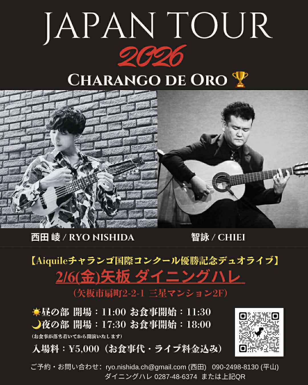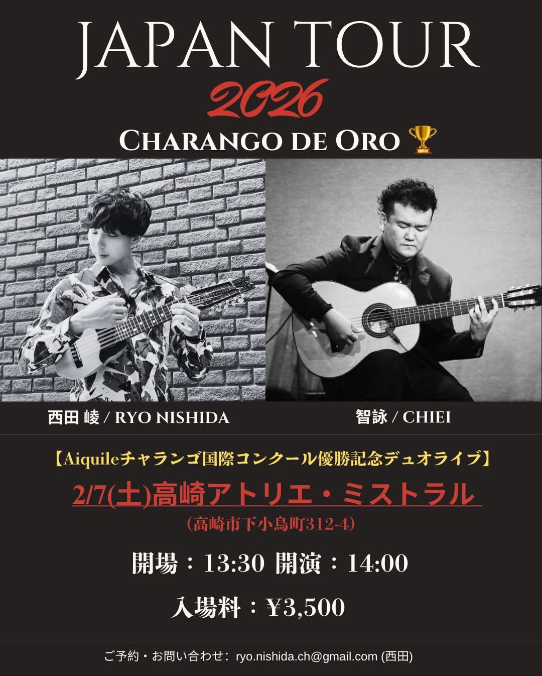 ★ボリビアの「アイキレ国際チャランゴコンクール」国際部門で2024年に優勝した西田崚さんの一時帰国&優勝記念ツアー、矢板に続き高崎公演で共演します。
